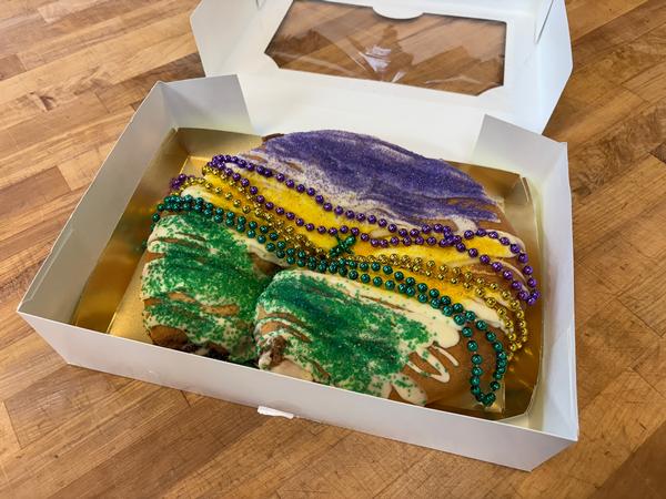 Happy soon-to-be Mardi Gras! This year our King Cakes are made with our sweet Challah dough and are topped with a traditional cream cheese frosting. Each King Cake also comes with an array of beads and babies for you to keep the King Cake tradition alive! Call now to place a preorder!